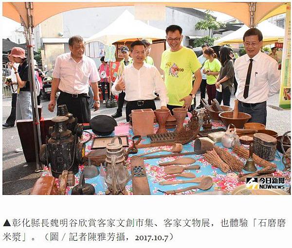 ▲彰化縣長魏明谷欣賞客家文創市集、客家文物展,也體驗「石磨磨米漿」。(圖/記者陳雅芳攝,2017.10.7)
