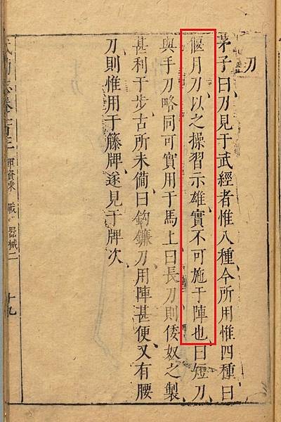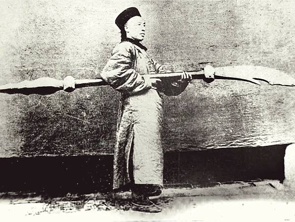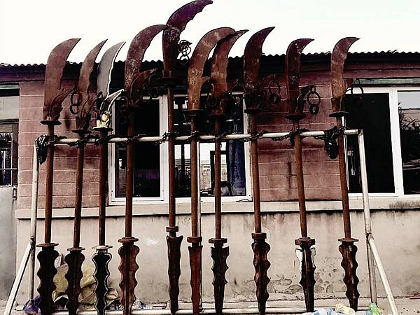 圖為明清時期的武舉考核大刀,重量按《皇朝禮器圖示》記載分別重120斤、100斤、80斤三等,刀刃亦未開鋒,顯然已退去其“戰場”傳奇色彩,如明代軍事家茅元儀所說:「偃月刀,以之操習示雄,實不可施於陣也」。但它們的形象似乎還是不時被一些小說情懷者結合上述的重量一併誇大