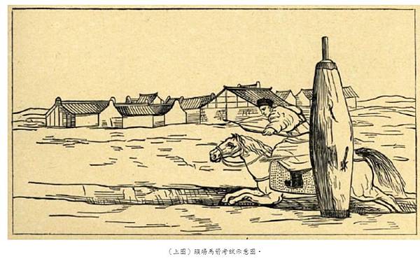 試馬上箭,豎立三把,每把以三十五步為則,照例九箭中四箭者合式。准入二場。