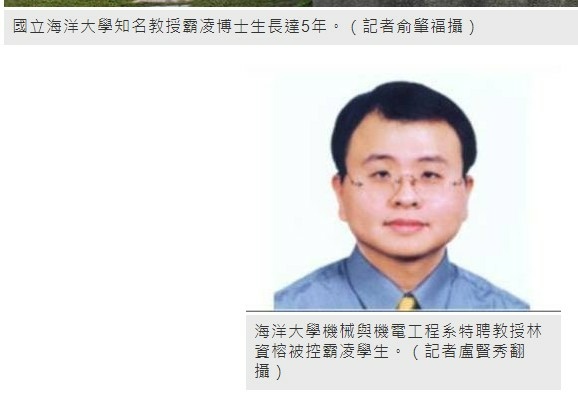 〔記者盧賢秀/基隆報導〕國立海洋大學傳出知名教授霸凌博士生事件,機械與機電工程系特聘教授林資榕,被學生投訴長期遭他辱罵、打耳光甚至丟麥克風,霸凌期間長達5年,直到林資榕當眾施暴才東窗事發,系、院教師評審委員會調查,認為證據確鑿,建議校方依《教師法》解聘,但校方最後只停聘2年,引起議論。
