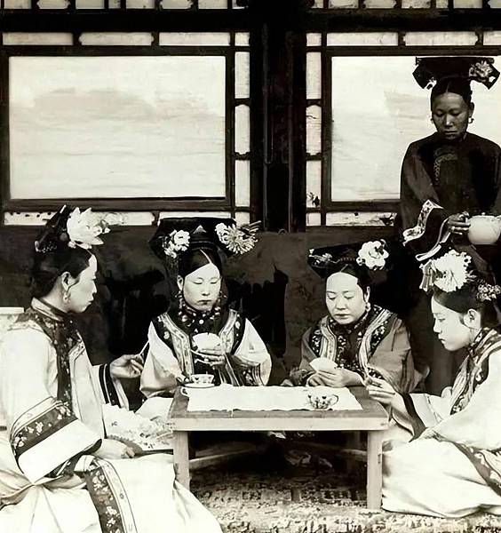 打牌的滿族女子,都是頭上戴著一對大翅膀,沈默寡言,玩起了撲克牌。身邊有仆人給倒茶,這一天過的很是愜意