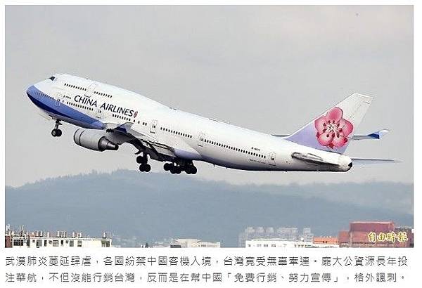 台灣民航最大機隊,具有官股色彩的「華航」還不需要改名嗎?Japan Airlines是「日航」、Thai Airways是「泰航」、Malaysia Airlines是「馬航」,那我們的China Airlines當然是「中航」。別再自欺欺人了,如今龐大公資源投注華航,不但沒能幫忙行銷台灣,反而是在幫中國「免費行銷、努力宣傳」,令人氣結!「中航」改名不涉修憲,全面執政的本土政黨,還在等什麼、怕什麼?2003年護照加註台灣至今已過十六年,促進國際社會辨別和認出旅客來自「Taiwan」,但上頭的China大字,仍易使外人將我們台灣人歸屬和中港澳一體,一如這次的「義大利禁中國飛機」事件。這次的「義大利禁中國飛機」事件。我們也該自我檢討,從自己改進做起,擺脫中國的無妄之災,更該表明和抗議WHO將台灣劃歸中國的粗暴和脫離事實;將來一併推動護照封面上China字縮小,或改用ROC縮寫,將中華郵政的China郵票改成「台灣」郵政和郵票,是採取一致措施,重新全球行銷「台灣」的時候了!自由開講》台灣飛機不是中國飛機! - 自由電子報 自由評論網 http://bit.ly/36T6asf