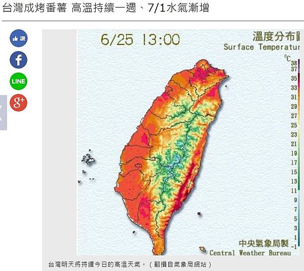 今天中午台灣於溫度分布圖中變身成一顆烤得幾乎通紅的「燒番薯」,各地高溫大抵都超過33度,今最高溫同樣在被焚風影響的台東太武,達36.7度https://goo.gl/9ZXHUx