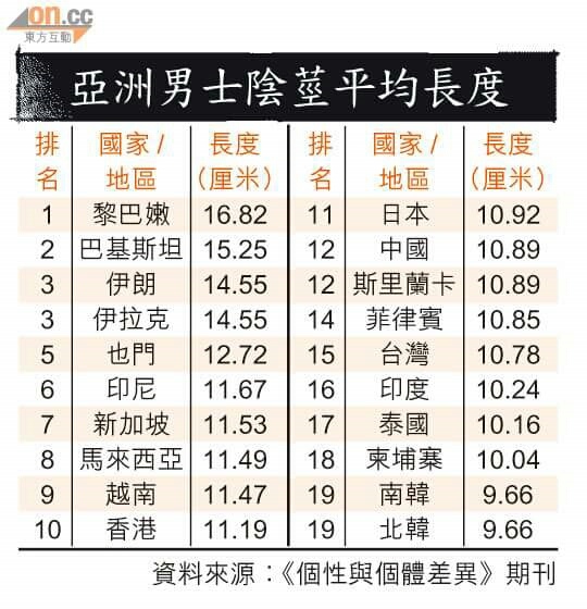 亞洲國家中印度平均長度5.4英吋(約13.7公分)排名第56名,日本則是5.34英吋(約13.6公分)排第61名,南韓以5.18英吋(約13.2公分)第65名,中國以5.15英吋(約13.1公分)排第68名,菲律賓則是4.27英吋(約10.8公分)第84名,台灣以4.24英吋(約10.8公分)排第85名,柬埔寨則是以3.95英吋(約10公分)排最後一名。