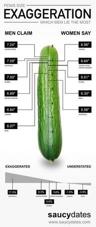 交友網站「SaucyDates」研究,美國男自稱有18.3公分,但女人卻只感受到16.8公分的衝撞;澳洲人吹噓有18公分,但女人收到的快感只有14公分,榮登「誇大第一名」;英國人給出18.3公分的答案,但只得到17.5公分的成績。