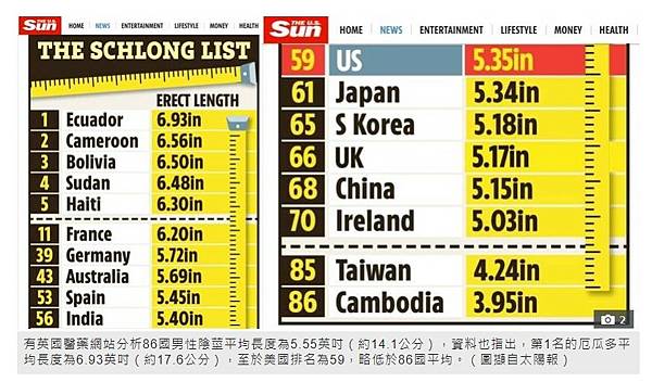 有英國醫藥網站分析86國男性陰莖平均長度為5.55英吋(約14.1公分),資料也指出,第1名的厄瓜多平均長度為6.93英吋(約17.6公分),至於美國排名為59,略低於86國平均。(圖擷自太陽報)