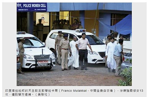 印度喀拉拉邦的天主教主教穆拉卡爾(Franco Mulakkal,中間全身白衣者),涉嫌強姦修女13次--印度性侵橫行!主教竟涉嫌強姦修女13次 - 國際 - 自由時報電子報 - https://goo.gl/4XJoFn