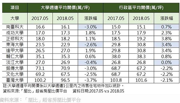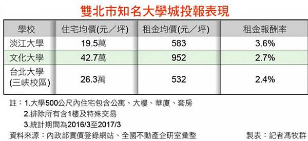 全國不動產根據實價登錄彙整雙北市知名大學城方圓500公尺內住宅交易發現,淡江大學住宅平均為每坪19.5萬元,租金平均為每坪583元,換算租金報酬率達3.6%,為雙北市最高;第2名為文化大學,住宅平均為每坪42.7萬元,租金平均每坪952元,租金報酬率為2.7%。台北大學三峽校區則以住宅平均每坪26.3萬元,租金平均每坪532元,投報率排名第3。