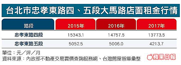 台北市實價登錄近日揭露一筆位於忠孝東路四段店面租金資料,總租金是1個月40萬元,單坪2.13萬元,也是2016年東區單價最高的店面,但此一租金水準跟2012年9月實價登錄最高單價3.16萬元相比,租金單價大跌逾3成。