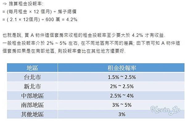 蘇明俊則以資本化率(編按:近似於收益率)來看租金報酬率。他表示風險較低的地區如台北或新北,資本化率低一些無妨;至於台中、新竹、高雄等地最好要有3%以上才值得入手。