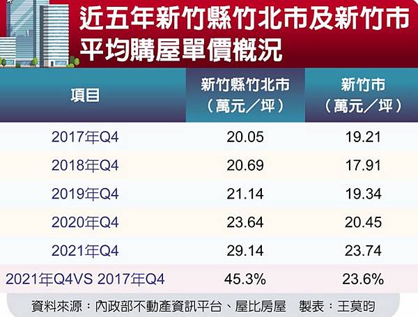 近五年新竹縣竹北巿及新竹巿平均購屋單價概況