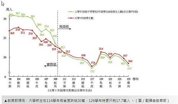 ▲教育部預測,大學新生在114學年將首度跌破20萬,126學年時更只剩17.7萬人 。(圖/翻攝自教育部)