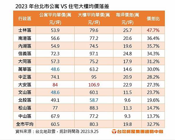 台灣房屋集團統計台北市各行政區今年公寓和住宅大樓交易均價,兩產品均價最高的都是大安區,大安區的大樓均價每坪106.9萬元,是各區唯一站上百萬元的區域,同樣住宅大樓,北投區均價僅58.7萬元,幾乎是大安區半價。