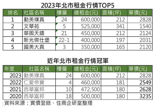 而近4年台北豪宅租金王,2020~2021為西華富邦分別以50萬、47.25萬元蟬聯冠軍寶座,2022年冠軍換仁愛帝寶,月租金46萬元,而最新、2023年的豪宅租金王則換勤美璞真接棒。