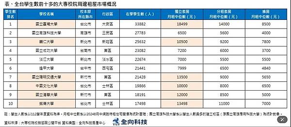 對此,全向科技房產中心總監陳傑鳴指出,近年來全台房價、租金漲不停,學生的租房壓力自然不斷加重,以北部大學來說,周邊分租套房的房租中位數基本都在8000-10000元,一年下來就要10萬上下的支出,對於自己負擔租金學生或是幫忙出租金的學生家長,都是一筆不小的開銷,造成很多預算有限的學生,如果想省錢,只能往租屋品質更差的雅房找尋標的,大大影響生活品質。