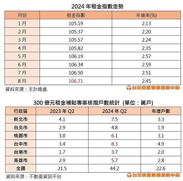 面對租金漲勢,政府300億元租金補貼政策也成了租屋族的及時雨,今年Q2租金補貼核撥戶數超過44萬戶,創下政策實施以來的新高,其中又以台中核撥8.3萬戶最多。