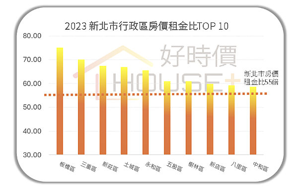 新北市近年房價節節高漲,部分地區甚至突破歷史新高,區內租金是否有跟上腳步?根據好時價最新發布的2023年新北市房價租金比,發現近10年新北市房價漲幅為37.38倍,房價租金比維持在55倍,與台北市相當,但其中板橋房價租金比來到75.06倍,也就是說,得花75年租金才能買下一間30~50坪房。