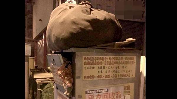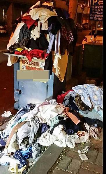 高雄市許多合法舊衣回收箱在夜間被不明人士塞爆無法再利用的舊衣,業者要花錢載去焚燒...
