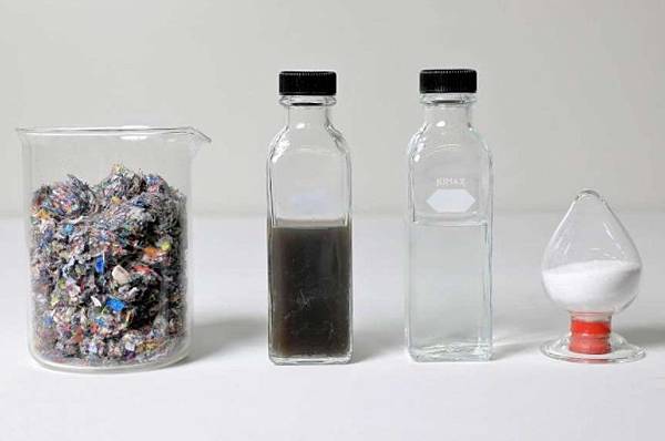 「這是二手衣製成的原料,」在桃園內壢的遠東新世紀研究所裡,遠東新協理張根源拿出了一罐液體。只要再經過脫色、反應結晶等程序,這一罐烏漆抹黑的液體,就可以重新製成衣服。