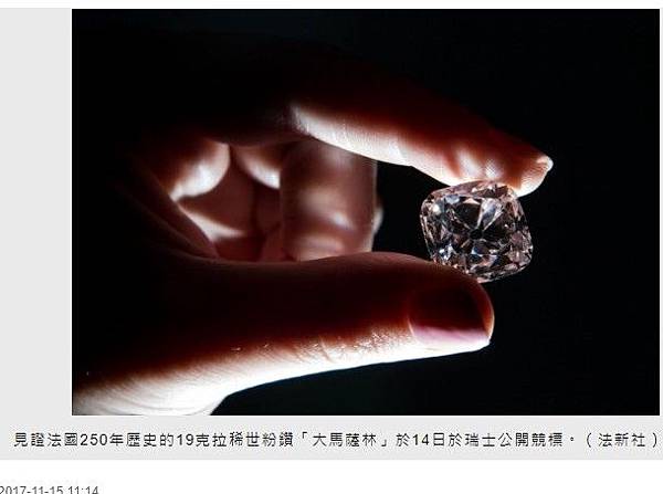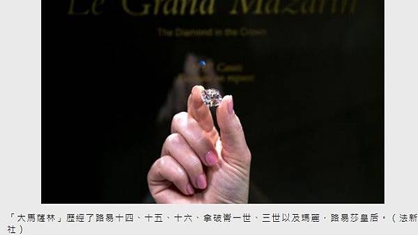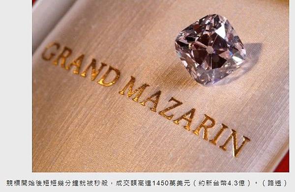 〔即時新聞/綜合報導〕曾鑲嵌於法國王冠、被路易十四等多位法國君王頂在頭上,見證法國250年歷史的19克拉稀世粉鑽「大馬薩林」於14日於瑞士公開競標,結果短短幾分鐘內就成交,成交額更高達1450萬美元(約新台幣4.3億)