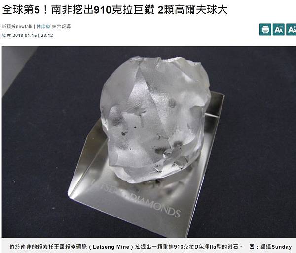 位於南非的賴索托王國賴岑礦脈(Letseng Mine)挖掘出一顆重達910克拉D色澤IIa型的鑽石。 圖:翻攝Sunday Times網站