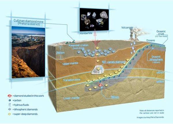 一般而言,鑽石形成於地下 150~200 公里處(軟流層),但加拿大阿爾伯塔大學地球科學教授 Graham Pearson 與來自帕多瓦大學、英屬哥倫比亞大學等校的專家,從南非知名 Cullinan 礦山下距離地殼不到 1 公里處找到一顆礦石,發現其內部竟包藏來自地函深處才存在的礦物「矽酸鈣鈣鈦礦」,也就是說,這顆鑽石來自地下將近 700 公里深處。