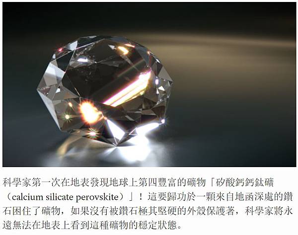 科學家第一次在地表發現地球上第四豐富的礦物「矽酸鈣鈣鈦礦(calcium silicate perovskite)」!這要歸功於一顆來自地函深處的鑽石困住了礦物,如果沒有被鑽石極其堅硬的外殼保護著,科學家將永遠無法在地表上看到這種礦物的穩定狀態。