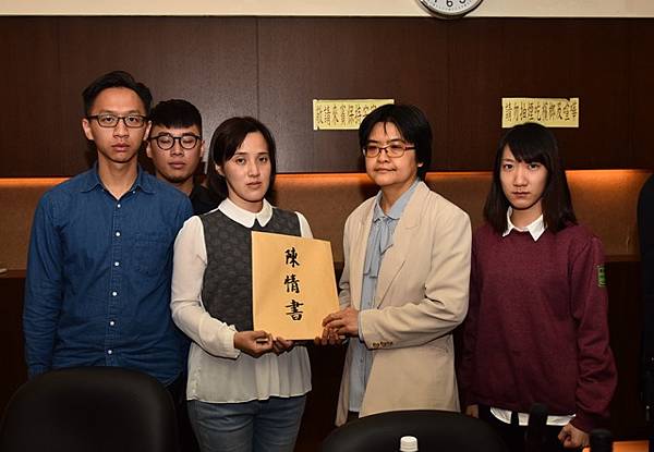 太極門弟子代表陳情行政院,由財政主計金融處副處長王淑端(右2)代表接受陳情,要求行政院遵守承諾監督財政部撤銷違法課稅處分。