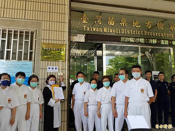 太極門弟子在律師陪同及平反1219行動聯盟、法稅改革聯盟聲援下,近百人到苗栗地檢署拉布條抗議並按鈴申告。(記者彭健禮攝)