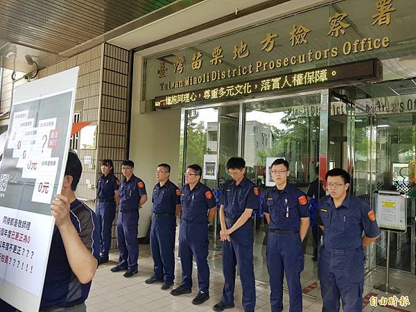 太極門等近百民眾,聚集苗栗地檢署前抗議、申告,驚動地檢署,請求苗栗縣警察局苗栗分局警警力支援維護現場秩序。 (記者彭健禮攝)