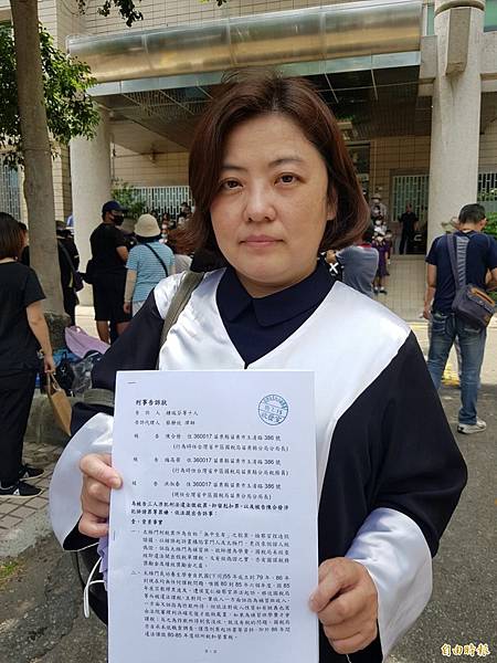 太極門委任律師蔡靜玫認為財政部中區國稅局苗栗分局的前任分局長陳合發、現任分局長洪淑春及稅務員梅高榮3人涉犯違法徵收、抑留剋扣罪,另告陳合發涉犯誹謗罪。 (記者彭健禮攝)