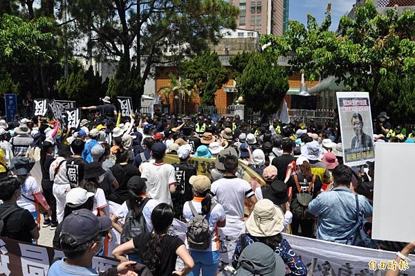 太極門弟子和公民團體成員包圍拍會場,拉布條、持字板抗議,並有多人手拿標單欲現場投標,但被拒於門外,群眾痛批拍賣程序違法,斥是黑箱作業。(記者彭健禮攝)