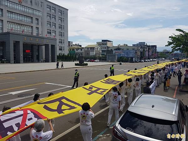 太極門弟子與平反1219行動聯盟、法稅改革聯盟等公民團體約500人,聚集在苗栗市府前路的行政執行署新竹分署苗栗辦公室前,拉起300公尺長的布條,高喊黑箱作業。(記者彭健禮攝)
