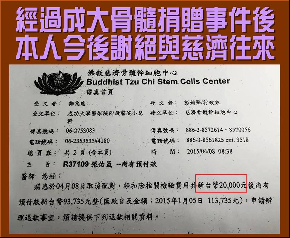 事件起因一位在成大就診小朋友,原本要接受異體骨髓移植,但在預計捐贈時間時,病患因淋巴結腫大暫緩,不過在醫師、病患要求按計畫取髓時被慈濟拒絕,並且在下次移植日前,病患就不幸往生,雖然慈濟有將需要的11萬元退款,但仍有2萬元檢驗費用無法退,病患家屬便把慈濟骨髓幹細胞中心的退費傳真PO上網並說「再也不跟慈濟有任何來往」。