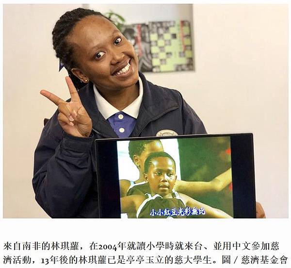 來自南非的林琪蘿,在2004年就讀小學時就來台、並用中文參加慈濟活動,13年後的林琪蘿已是亭亭玉立的慈大學生。圖/慈濟基金會提供