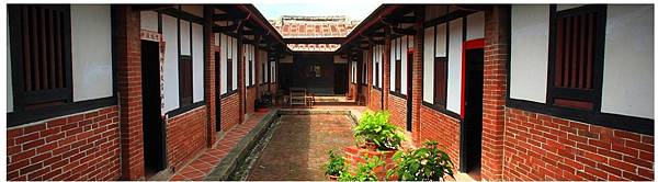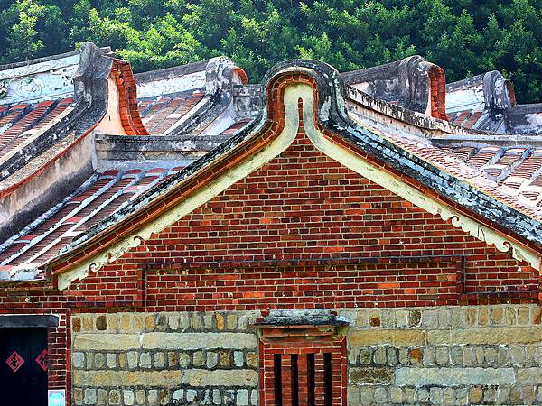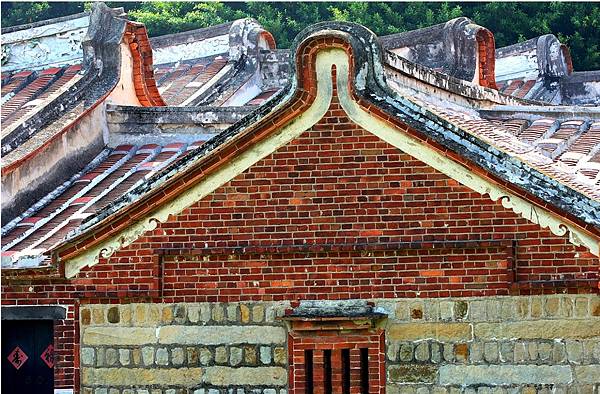 高低交錯的馬背型屋脊和剪黏,還有以荷蘭式磚砌牆面及磚柱建造,搭配以石板條垂直排列的直櫺窗,更顯出古拙樸實韻味;正廳門上的門額,斗大兩個字「外翰」,呈現耕讀農家的沈穩厚重風格,令人印象深刻!