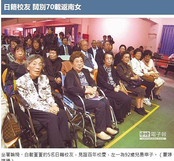 魂牽夢縈的母校,讓坐輪椅、髮蒼蒼的5名日籍校友,遠渡重洋回到母校台南女中,見證百年校慶;台南女中今年迎接百歲生日,校友會費心從日本找回92歲兒島幸子等5名校友,兒島幸子雖動了胃癌手術身體不佳,仍努力復健,一心想回母校,回到母校當場灑淚。