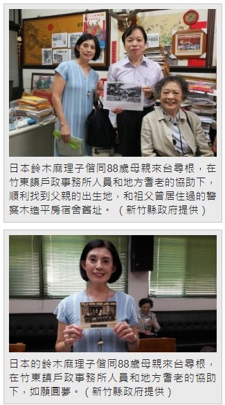 〔記者廖雪茹/新竹報導〕來自日本的鈴木麻理子,為了找尋祖父及父親當年在台生活歷史足跡,日前特地偕同88歲母親來台尋根,在竹東鎮戶政事務所人員和地方耆老的協助下,不但找到父親的出生地,和祖父曾居住過的警察木造平房宿舍舊址,還獲贈竹東日治時代場景的複印照片一批,讓母女倆喜出望外,頻道感謝。