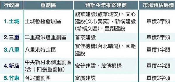 根據《住展》雜誌從市調資料統計預估,今年北台灣預計將有土城暫緩發展區、三重二重疏洪道、八里港特定區、中央新村北側重劃區,以及竹東台泥重劃區等5新興重劃區,分別有新推案登場。