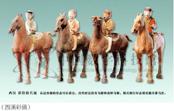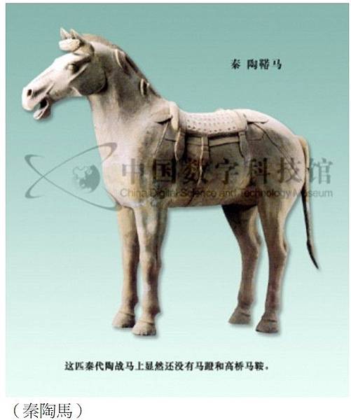 始皇陵兵馬俑中具有表現細致的馬具,卻惟獨沒有高橋馬鞍與馬鐙