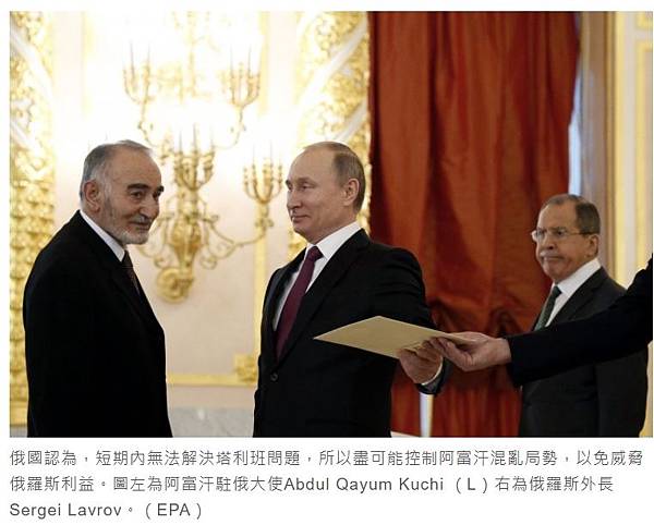 俄國認為,短期內無法解決塔利班問題,所以盡可能控制阿富汗混亂局勢,以免威脅俄羅斯利益。圖左為阿富汗駐俄大使Abdul Qayum Kuchi (L)右為俄羅斯外長Sergei Lavrov。(EPA)