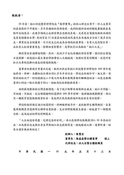 文末指出,學校除按照規定進行相關停招、停辦報部程序外,並啟動學生輔導機制,妥善處理教職員資遣及學生轉學安置,保障教職員生權益。