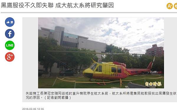 分享黑鷹服役不久即失聯 成大航太系將研究肇因到Facebook 分享黑鷹服役不久即失聯 成大航太系將研究肇因到Line 分享黑鷹服役不久即失聯 成大航太系將研究肇因到Google+