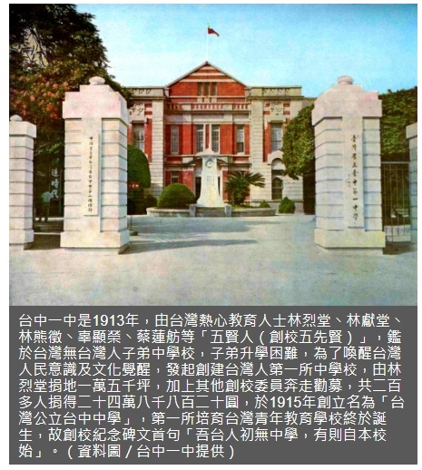 台中一中是1913年中部林獻堂、林烈堂、辜顯榮、蔡蓮舫、林熊徵等人為首發起由民間捐款建築校舍,再捐獻給日本政府,1915年台灣總督府核准辦學,中一中創校紀念碑記載:「吾臺人初無中學,有則自本校始。」