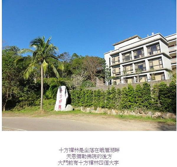 ▉新竹峨眉十方禪林,面臨峨眉湖畔,峨眉湖位於新竹縣峨眉鄉與苗栗縣南庄鄉交界,臨近十二寮休閒農業區和峨眉天恩彌勒大佛,是山靈水秀的一方淨土。湖面山光水色碧連天,白鷺鷥優哉翔遊其間,十方禪林的殿堂、房舍四周樹木扶疏,山門面對著蘊含境界般若觀想之瀑布,沐浴於森林之禪修中心讓人進入「溪聲盡是廣長舌、山色無非清淨身」之境界。開山方丈首愚法師以出世的精神做入世的事業,自一九八五年十月三十日創建道場,迄今正逢三十周年。