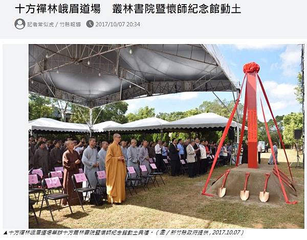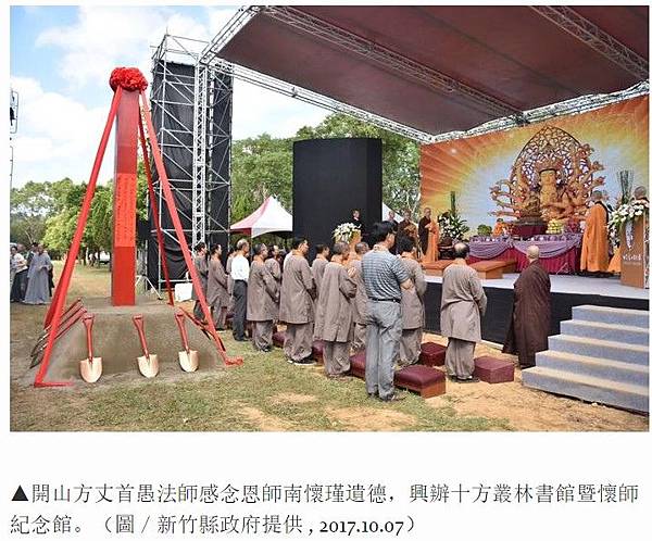 新竹縣峨眉鄉十方禪林「為傳統佛教樹正脈,為海眾清修建道場」,開山方丈首愚法師感念恩師南懷瑾遺德,在其冥誕百歲圓寂五周年舉辦十方叢林書館暨懷師紀念館動土,縣長邱鏡淳、副縣長楊文科、前國發會副主委黃萬翔、峨眉鄉長江寧增等應邀出席表達祝福之意,讚頌教育、弘化、慈濟共舉,貢獻社會、造福人群。