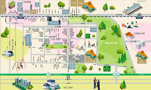 重劃區內公園綠地佔比約17.78%,包括王爺壟運動公園、公二、公三、公四及公五公園。交通動線也是湖口一大優勢,生活圈緊鄰國道1號湖口交流道、台31線,還有湖口車站兩站即可到竹北站。