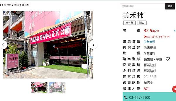 接著同區段、新興路上,還有百麗建設「美禾柿」剛公開,基地臨幹道,規劃42戶(含1戶店面),為22~32坪2~3房,開價30~35萬/坪。