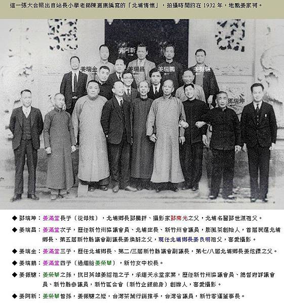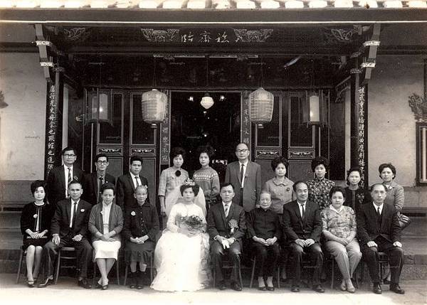 翻開父親的相簿,有一張父母親的結婚照,拍攝年代為1965年,場景在北埔老姜家族天水堂老屋的正廳前,這張照片中的人物都是當時男女雙方的親友,比較特別的是北埔新姜家族的姜炫達校長(後排左1)及夫人姜杜春蓮女士(後排右1)亦在其中,炫達時任北埔國中校長,他不僅是族親長輩,也是同在北埔國中任職的父親的長官,這場婚禮中他也是父母親的介紹人,照片中除了男女主角父母親之外,還有曾祖母姜彭味妹(右4)、祖父姜重枬(右3)、祖母姜李榮妹(右2)及輩份最高,曾任新竹女中校長的姜瑞鵬(右1),而女方的長輩代表是外祖父的兄長張杜源(左2)。