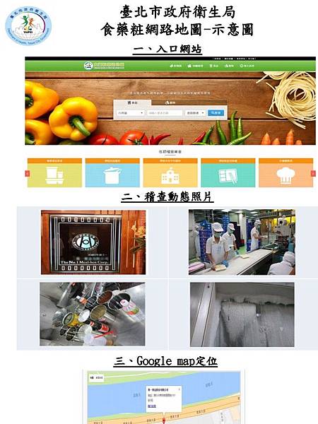 食品藥物管理處長王明理表示,過去公部門公布稽查或店家訊息,只能用新聞稿等文字方式呈現,民眾無法即時查詢,想看資料還要上網下載,很不方便。這次將稽查系統與google map結合,提供民眾便捷查詢的友善介面,可查詢餐飲業者定位、歷次衛生稽查結果及內部環境、衛生缺失等照片。